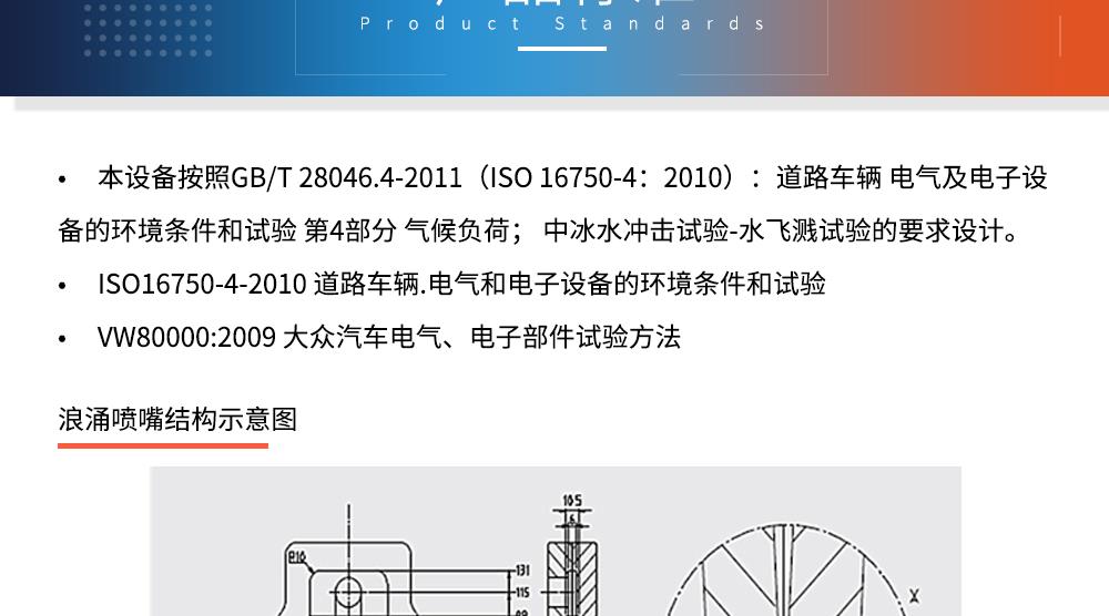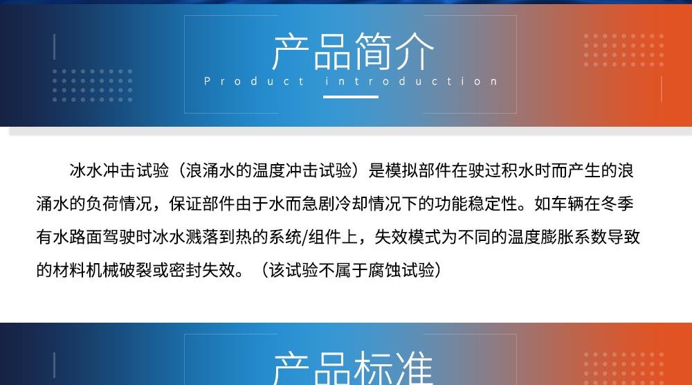 用途:冰水沖擊試驗(yàn)(浪涌水的溫度沖擊試驗(yàn))是模擬部件在駛過(guò)積水時(shí)而產(chǎn)生的浪涌水的負(fù)荷情況,保證部件由于水而急劇冷卻情況下的功能穩(wěn)定性。如車輛在冬季有水路面駕駛時(shí)冰水濺落到熱的系統(tǒng)/組件上,失效模式為不同的溫度膨脹系數(shù)導(dǎo)致的材料機(jī)械破裂或密封失效