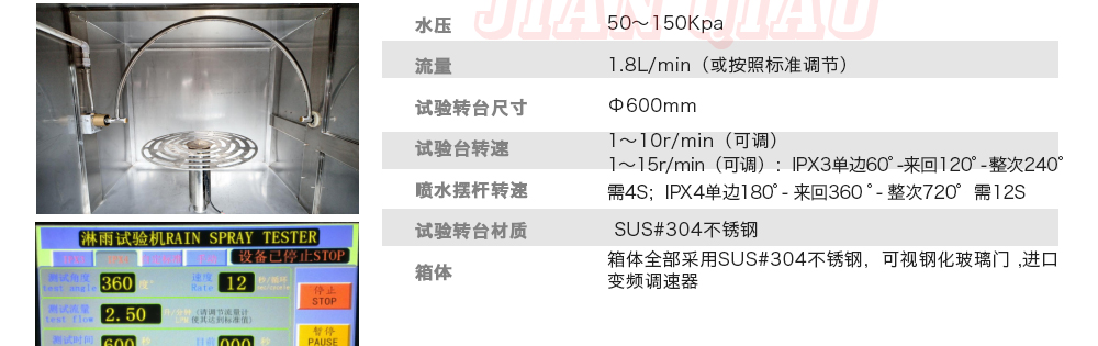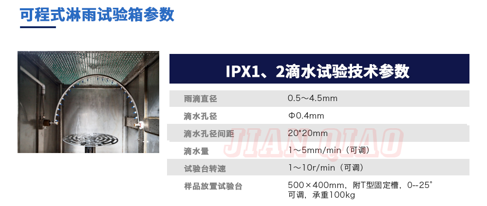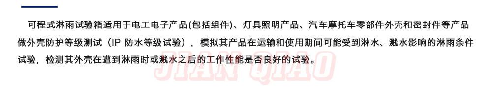 用途:可程式淋雨試驗(yàn)箱適用于電工電子產(chǎn)品(包括組件)、燈具照明產(chǎn)品、汽車摩托車零部件外殼和密封件等產(chǎn)品做外殼防護(hù)等級(jí)測試(IP 防水等級(jí)試驗(yàn)),模擬其產(chǎn)品在運(yùn)輸和使用期間可能受