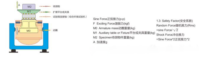 這里,m1是試件的質量;m2 是夾具的質量;m3 是振動臺可動系統(即動圈)的質量;m4 是垂直擴展臺面的質量(當振動臺工作于水平振動時,m4 為水平滑臺可動系統重量)。